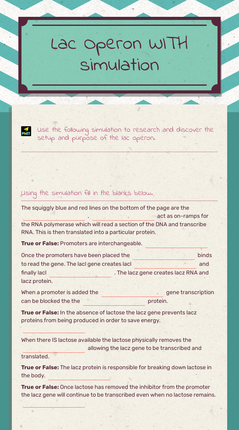 Lac operon diagram the regulation of the lac operon for each of the . The lac operon is either inducible or repressible. Quickly find that inspire student learning. Purpose of this worksheet is not to get quick, right answers but to comprehend. Using the materials listed above and figures 15.3 & 15.4, demonstrate the repressible trp operon and the inducible lac operon. Coli is an example of an inducible operon. Complete the comparison of the lac operon and trp operons as a means of gene regulation. Lac operon simulation today you will work with a simulation1 . What protein in encoded by the laci gene? This activity will guide a student to understand how each molecule in this simulation functions to regulate lac operon gene expression. Find lac operon lesson plans and teaching resources. The lac operon in e. The lactose (lac) operon contains 5 important sequences that allow it.